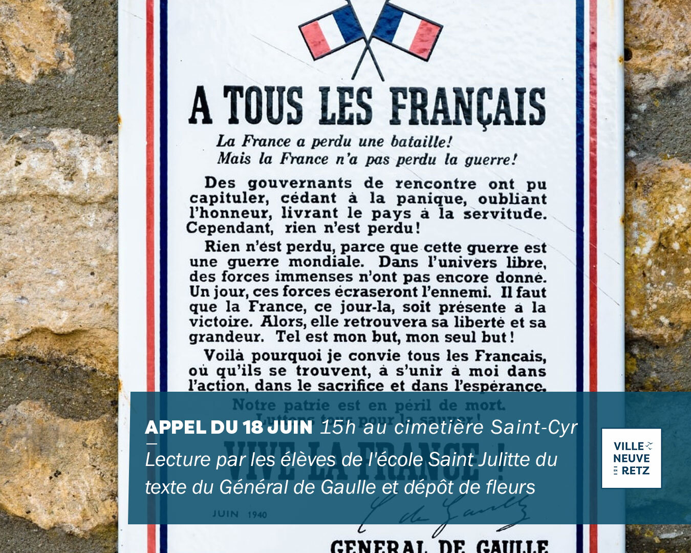 Organisée par le Souvenir Français, elle sera marquée par la lecture du texte de l’Appel du 18 juin par les élèves de l’école Saint Julitte, suivie d’un dépôt de fleurs.