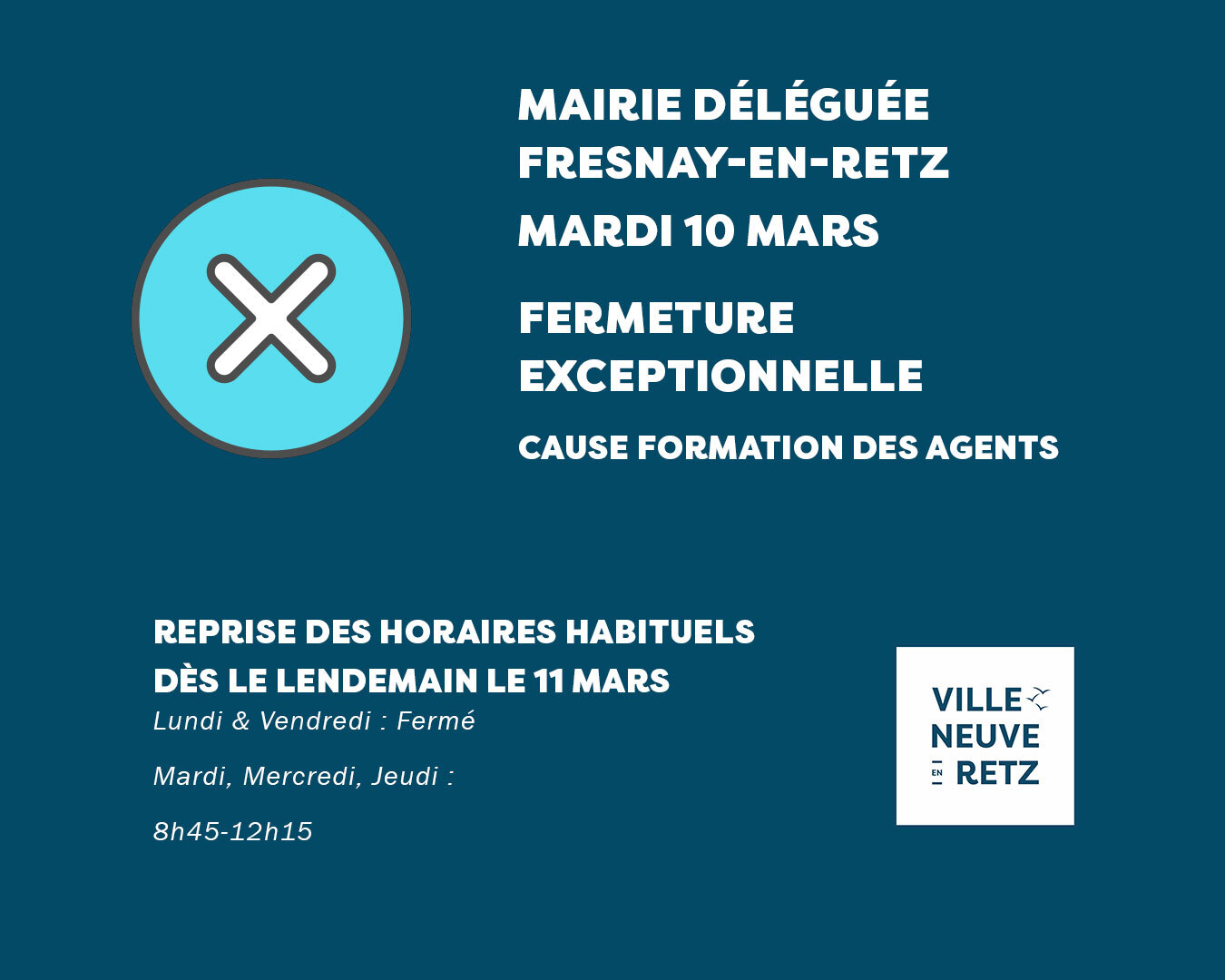 La mairie déléguée de Fresnay-en-Retz sera exceptionnellement fermée le mardi 10 mars, pour cause de formation des agents.